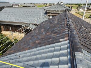 250620085648623西区で地震で棟瓦が崩れてしまいました途中から増築されてて続きを同じ安田瓦にする事を提案させていただきました瓦を撤去すると野地もかなり傷んでました 野地補強して防水シート張